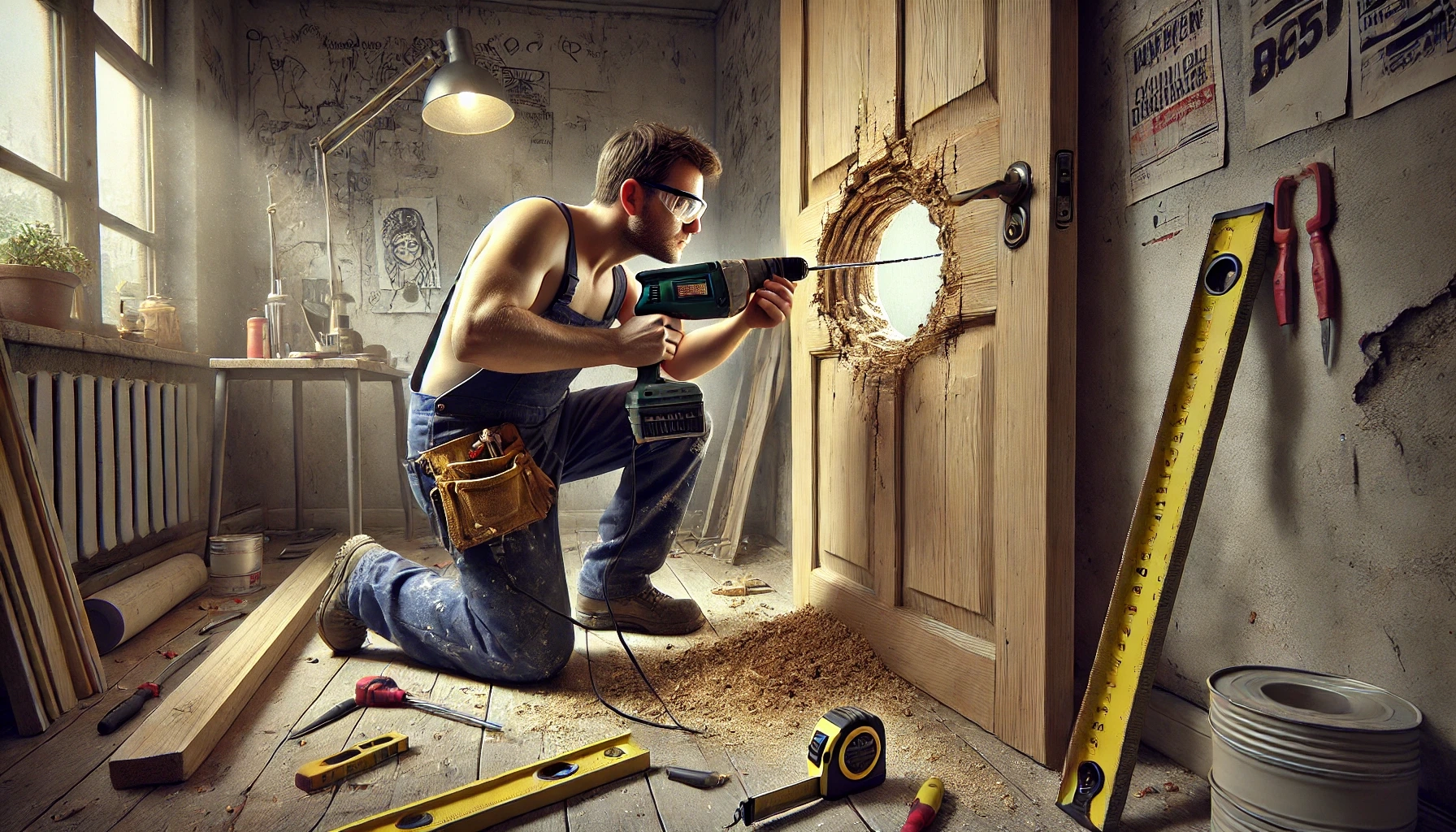 How Are Glory Holes in Bathrooms Made? Asking for a Curious Carpenter Man Drilling Hole in Door
